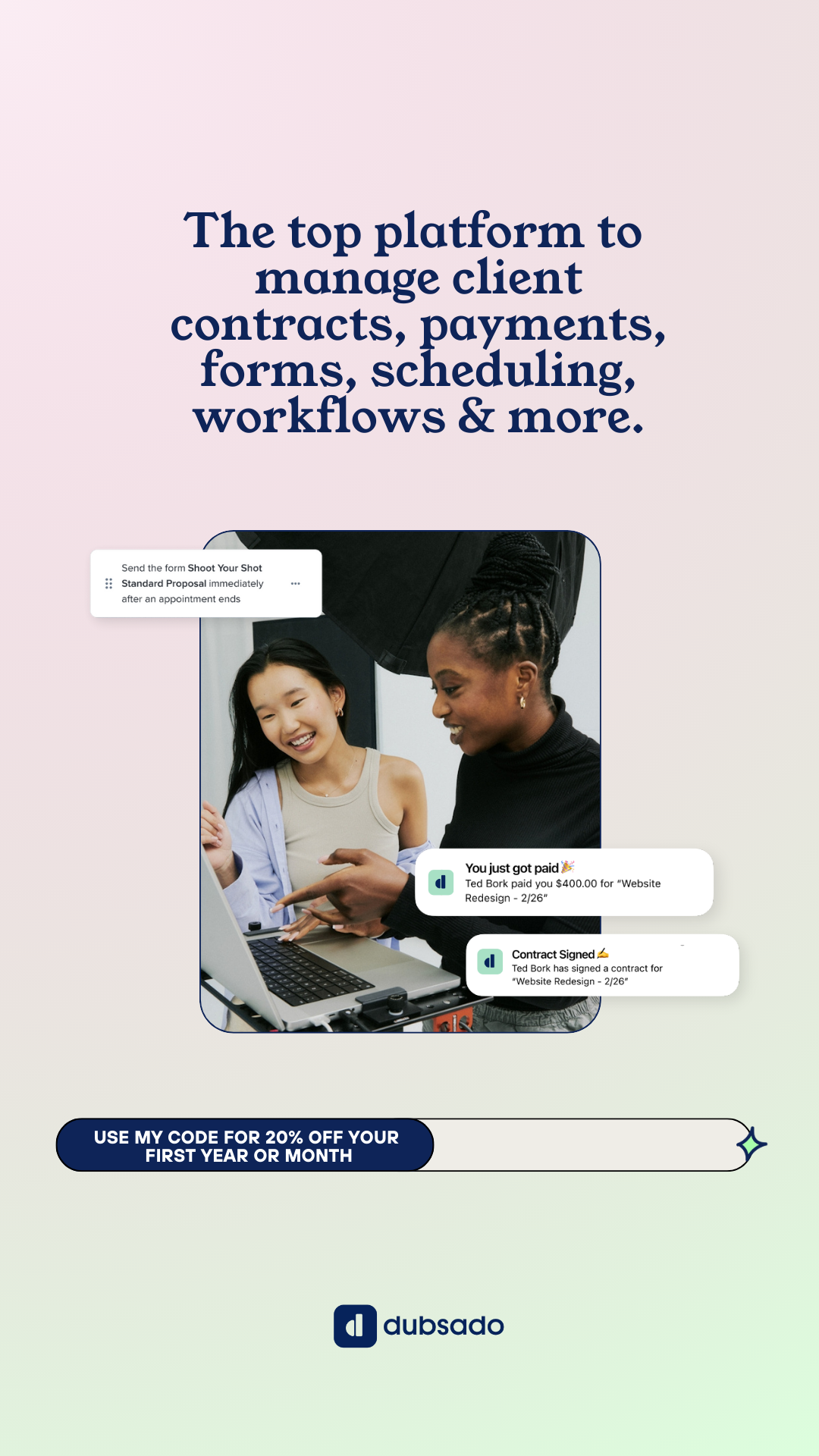 Make sure to use my Dubsado discount code: HeyRachael to save 30% off your first month or year!