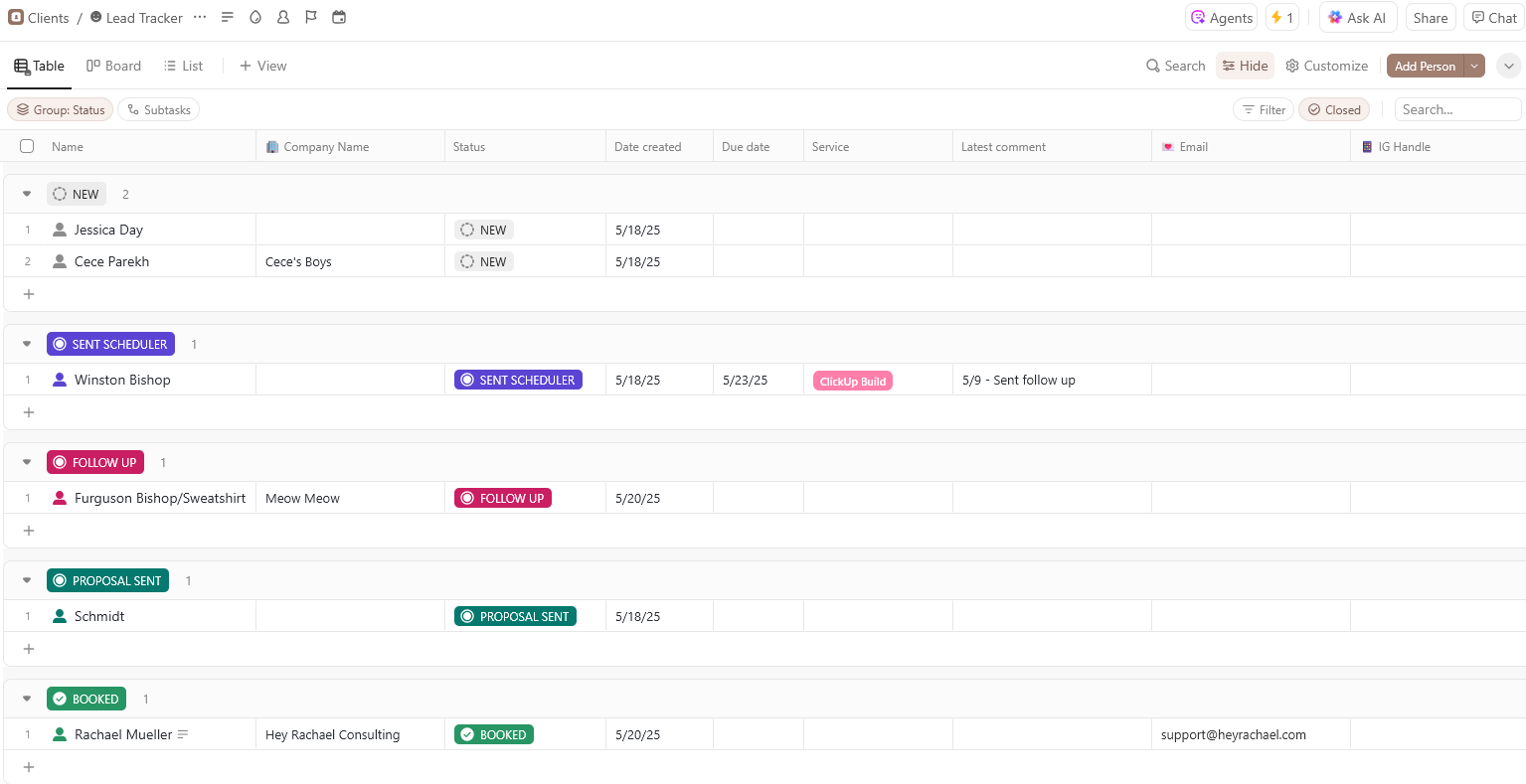 Inside the ClickUp lead tracker, you can organize leads by:
