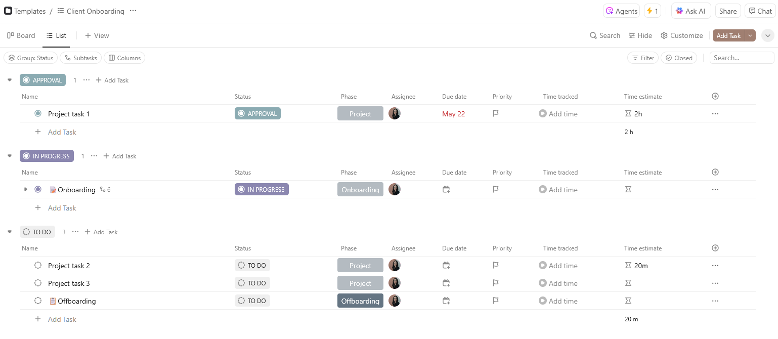 Create aClickUp project management template for onboarding. Once a client signs their contract in Dubsado, you can even useZapier/ClickUp automations to trigger your onboarding template to launch automatically in ClickUp (more on this later!)