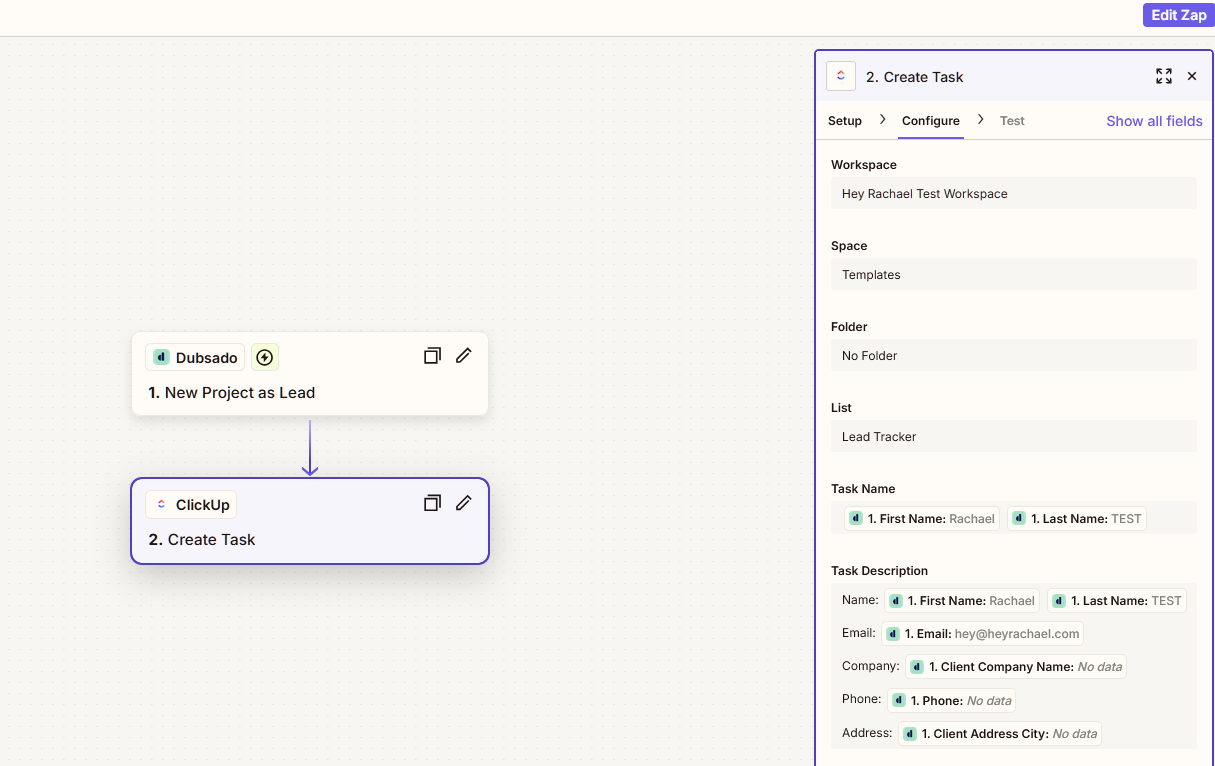 New Dubsado lead → Create new task in the ClickUp Lead Tracker with all their info