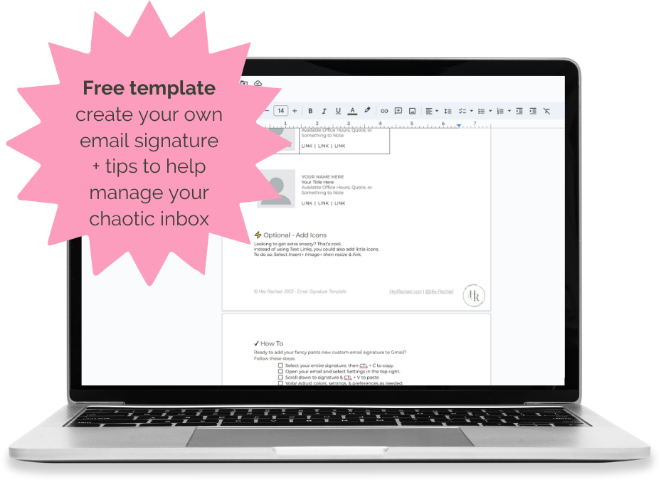 This includes a template to create your own email signature, instructions how to implement, and some tips around email boundaries and managing a chaotic inbox.